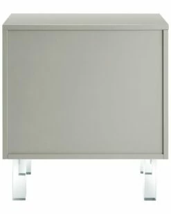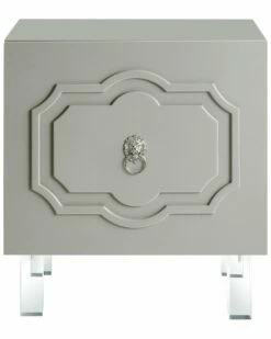 - Design details: MDF construction; lacquer finish with Lucite legs, two shelf cabinet with decorative door and silver ring pull