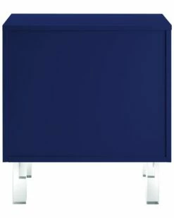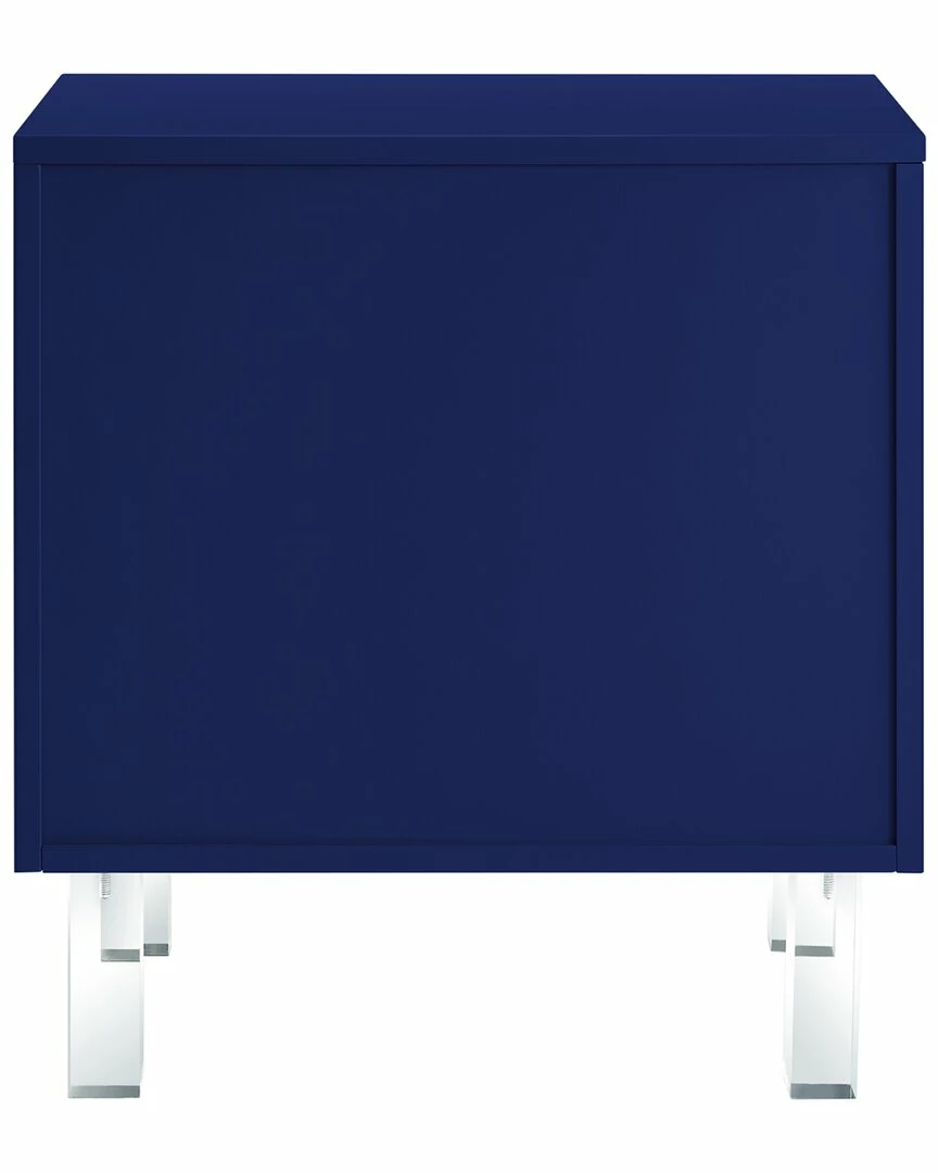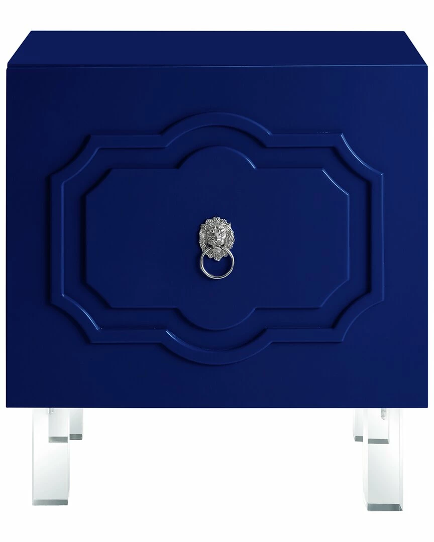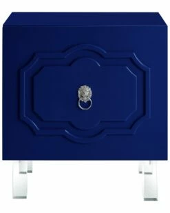 - Design details: MDF construction; lacquer finish with Lucite legs, two shelf cabinet with decorative door and silver ring pull