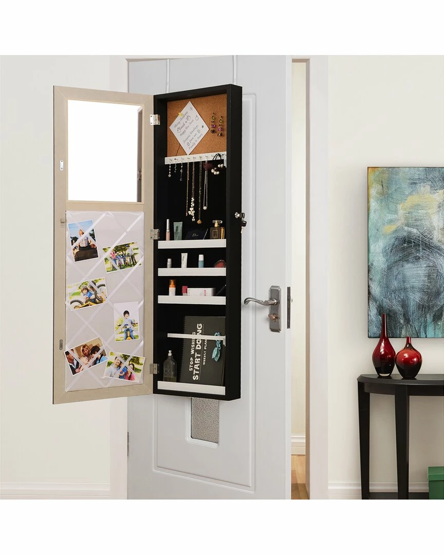 - Design details: MDF and mirror construction; high gloss finish; full length; hanging mirror border door; velvet interior; 35 metal necklace hooks; five bracelet hooks; three bars to hold 75 earrings; cushioned holes for up to 50 rings or stud earrings; smart pouch for documents; six individual compartments composed of four shelves; two pull out drawers