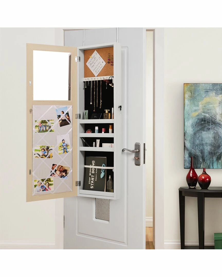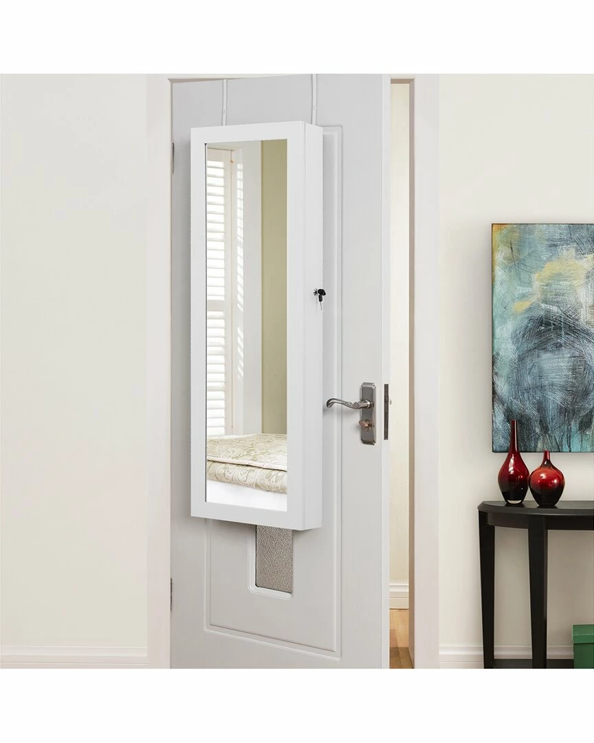 - Design details: MDF and mirror construction; high gloss finish; full length; hanging mirror border door; velvet interior; 35 metal necklace hooks; five bracelet hooks; three bars to hold 75 earrings; cushioned holes for up to 50 rings or stud earrings; smart pouch for documents; six individual compartments composed of four shelves; two pull out drawers