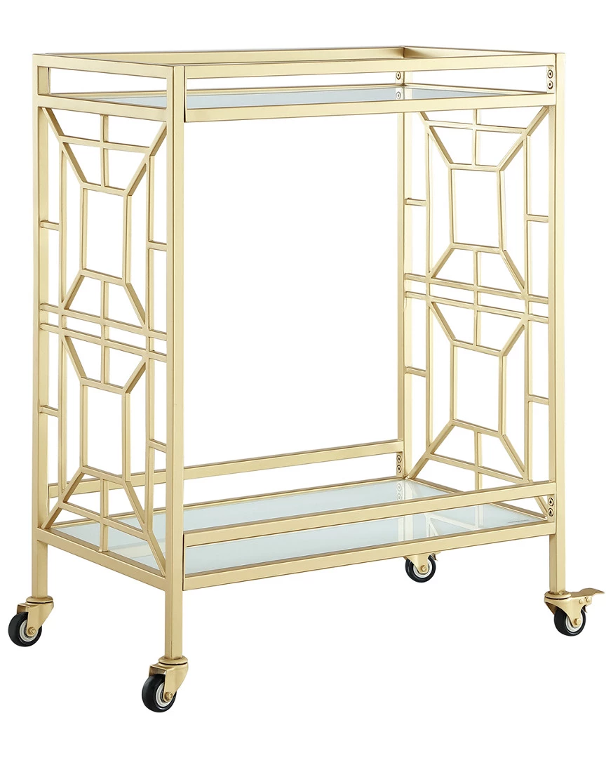 - Design details: Your home deserves nothing but the best. Impress your guests with this versatile indoor bar cart. It is a perfect storage solution for a cocktail. The caster wheels make it easy to keep this cart where the party is happening. This utility cart is great for the kitchen, dining room, bedroom, bathroom and home office. It is perfect for holding dinnerware, beverages, books, bathroom accessories. The carts metallic finish and geometric design add retro/vintage appeal, and the tempered glass shelves provide exceptional display and storage capacity. On the top shelf you can display your treats and drinks and bottom shelf is perfect for wine bottles and stemware storage